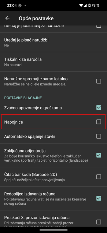Opciju prihvaćanja napojnica omogućimo u općim postavkama Android aplikacije pod Postavke - Opće postavke, gdje označimo opciju za napojnice.